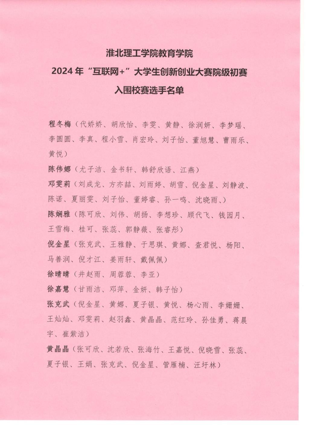 永利集团304am登录2024年“互联网+”大学生创新创业大赛院级初赛入围校赛选手名单