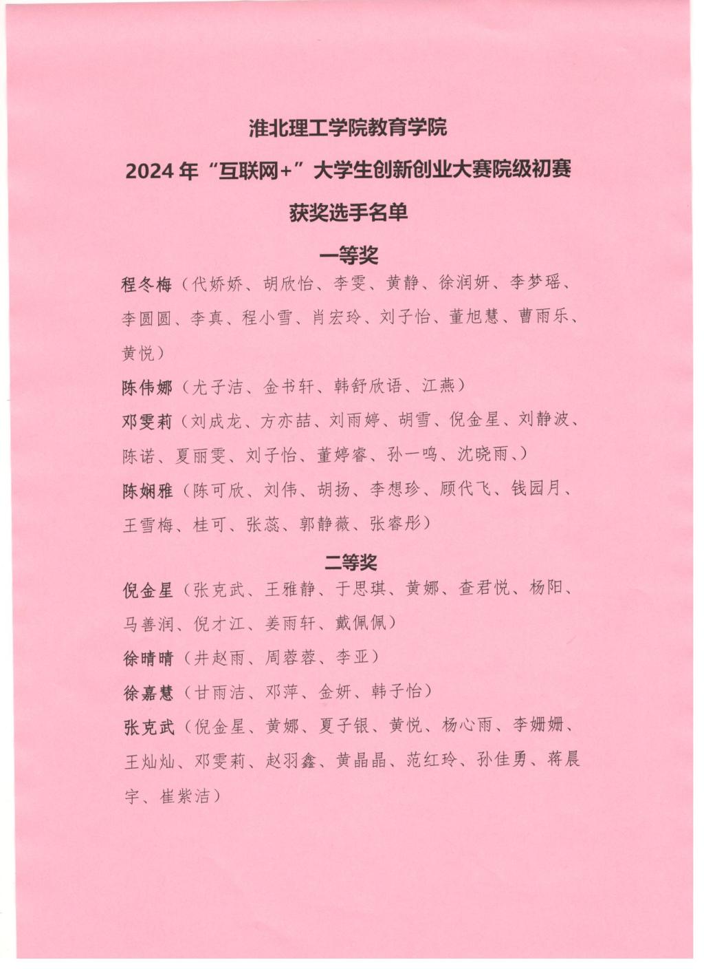 永利集团304am登录2024年“互联网+”大学生创新创业大赛院级初赛获奖选手名单