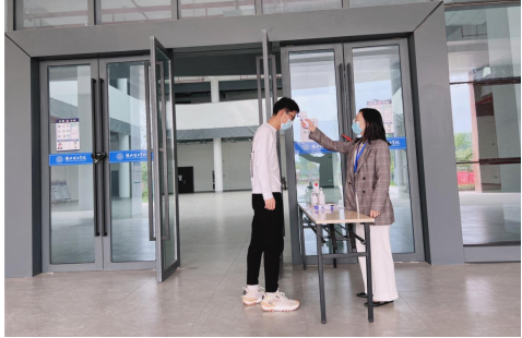 下午14时30分,第二组2名成员和第三组2名成员分别在行政楼和艺术楼门口集合,对进出人员进行体温测量和信息登记,并提醒出入公共场合需佩戴口罩。