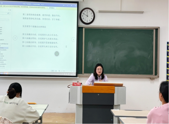 为深化党性教育,加强纪律建设,进一步提升支部党员的纪律和规矩意识,永利集团304am登录汉语言文学专业学生第一、第二党支部于5月8日12时1教307顺利开展了“党纪学习教育主题党课”,重点对(《中国共产党廉洁自律准则》和《关于新形势下党内政治生活的若干准则》)进行交流与学习。此次活动由党支部书记张颖颖同志主持,并作专题党课学习。