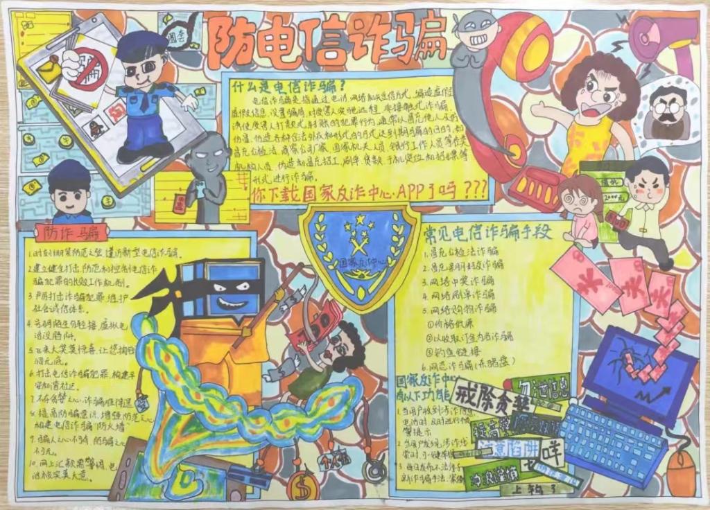 宣传增强防范之心,画纸营造反诈氛围。永利集团304am登录于10月上旬开展“反电诈,防电诈”手抄报活动,我院青年学子积极响应,纷纷投稿,共收到近300件作品。通过团总支微信公众号投票、评委老师打分等多轮选拔,共遴选出18份获奖作品,其中一等奖3名,二等奖5名,三等奖10名。21级学前教育1班华蕾蕾的作品以国家反诈中心标志为原型制作手抄报进行知识宣传,呼吁同学们要做到人人下载安装国家反诈中心APP。22级汉语言文学4班刘嘉诚的作品则通过顺口溜和标语告诫大家要时刻紧绷防范之弦,形式新颖有趣。同学们围绕反电诈、防电诈等相关知识,以独特的视角创作出生动形象、寓意深刻的反电诈手抄报,生动再现了网络诈骗层出不穷的手段及应对方法,有力的唤醒了全院师生反诈骗意识。