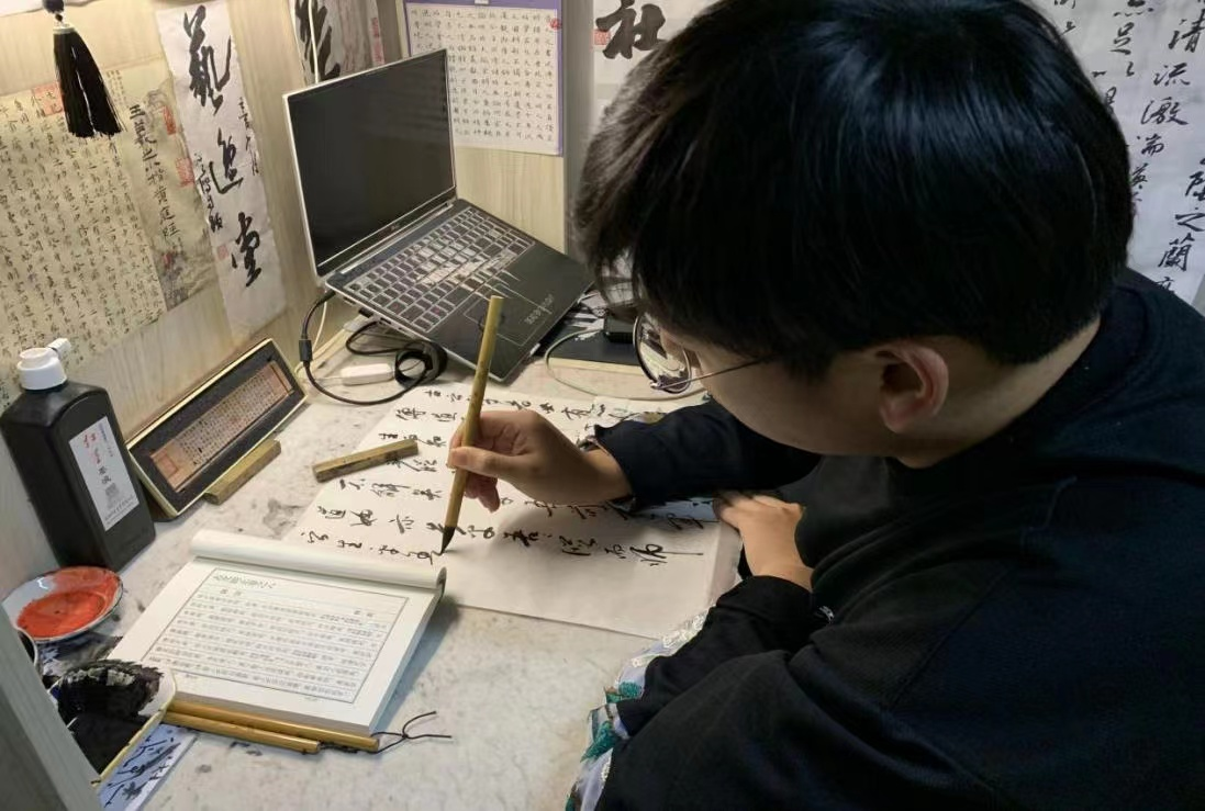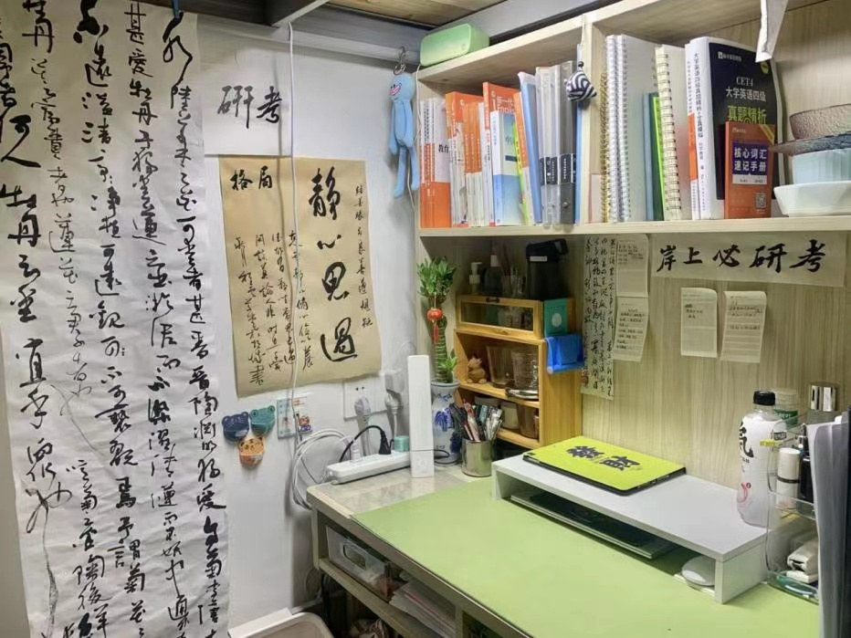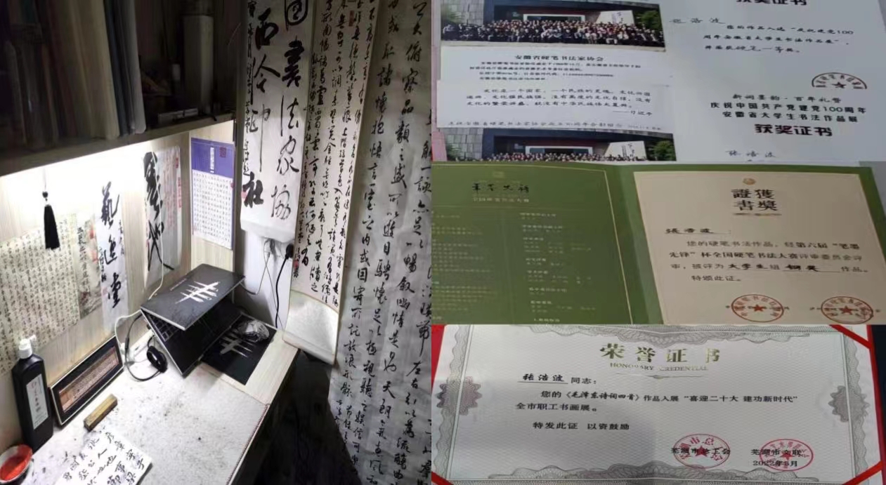 其中651宿舍的张浩波同学热爱学习、热爱生活,积极发挥共产党员的先锋模范作用,把自己对书法的热爱融入宿舍建设,带动室友一同学习书法、热爱书法。651宿舍文化特色明显,以卷轴墨字为景装点宿舍,舒心简洁的物品陈列,在宿舍弘扬中国优秀传统文化,把书卷秀气带入生活,让宿舍同学感受点墨之美。
