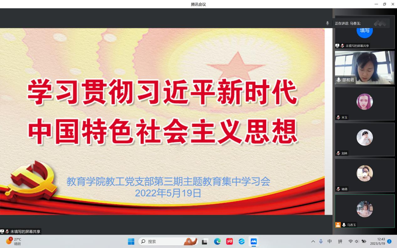 5月19日下午,永利集团304am登录学习贯彻习近平新时代中国特色社会主义思想主题教育开展第三期读书班党课学习,本次学习会以“线上课堂”形式举行,由教工党支部委员邵和君同志主持并领学。