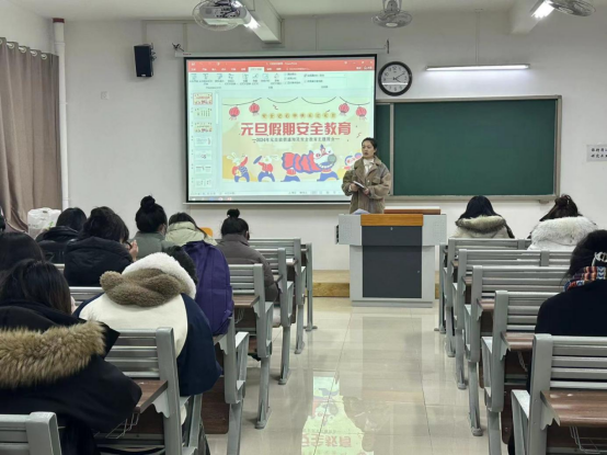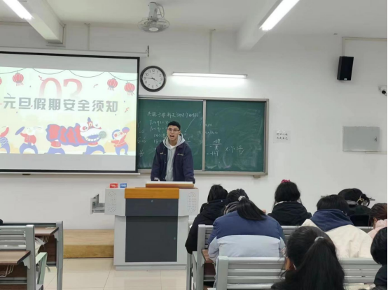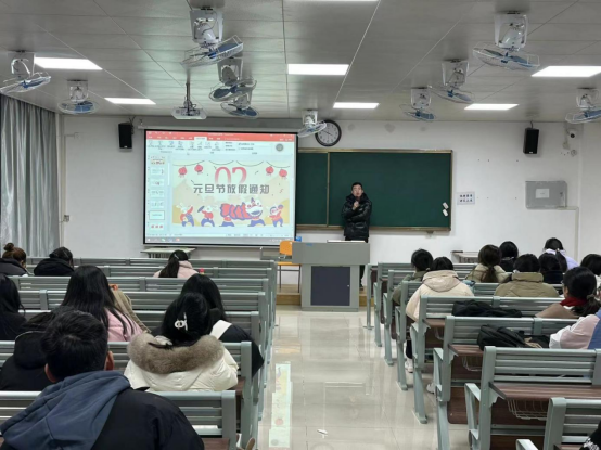 会上,辅导员老师们要求大家合理规划“元旦假期”,积极调整自己的学习和生活状态,劳逸结合,为期末考试积极做好准备。离校返家的同学要按规定报告自己的往返时间和车次。从寝室用水用电、交通、卫生健康、消防、居家生活、防范电信诈骗、防寒保暖等方面对学生进行了安全主题教育。告诫同学们一定要遵守交通规则,保持良好卫生习惯,学习和掌握消防知识,不在寝室使用违规电器、不私拉乱接电线网线等,提醒同学们离校前进行宿舍安全卫生自查,将门窗紧闭,以免造成水管爆裂事故发生。